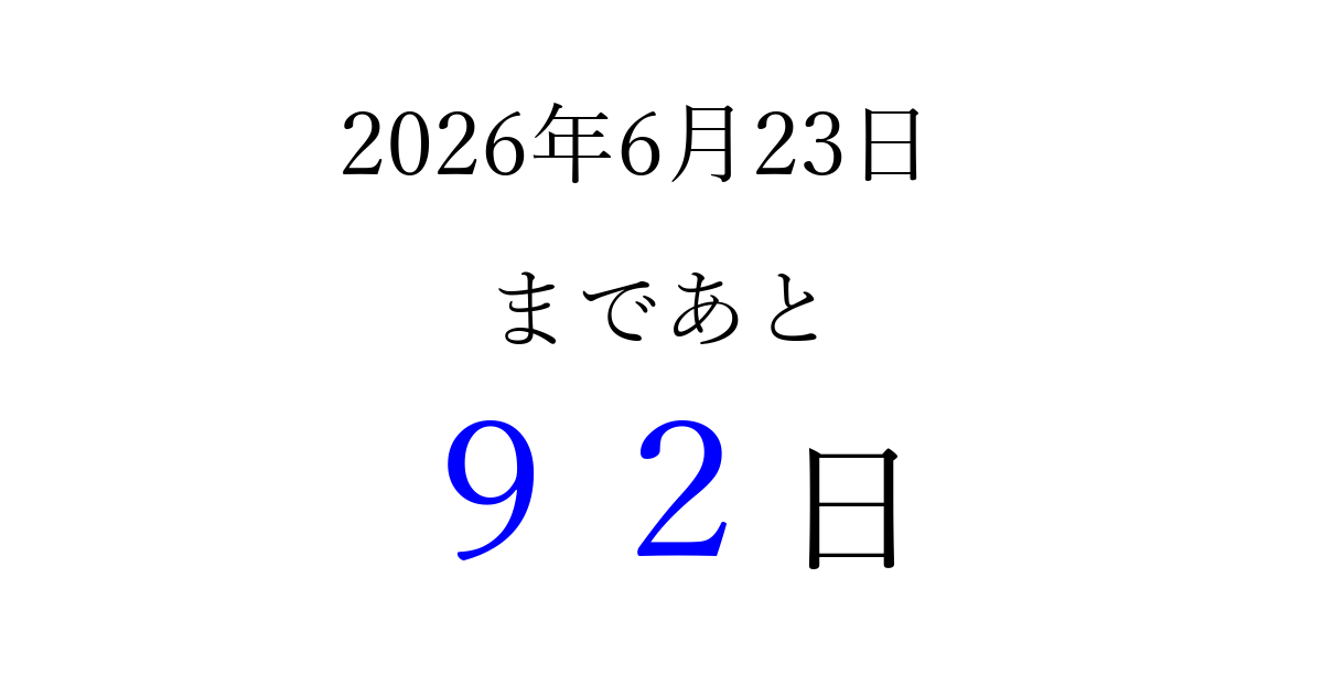 2026年6月23日(火)まで あと 99 日です 追加すると、トップページからすぐ選べるようになります ※2026/03/23現在の結果です。 最新の状態に更新する ↓シェアして、タイムライン上にカウントダウンを表示しよう!↓ 📤 この結果を共有する Tweet シェア Threads Bluesky 別の日付でカウントダウン 2026年6月のカレンダー このページをブックマークに追加すると、いつでもカウントダウンを確認できます。 (PC: Ctrl+D / Mac: ⌘+D) hitome-notes.comでは以下のページも運営しています。 指定日と期間から日付を計算 | ガチャ確率計算・シミュレーション | プライバシー・ポリシー 運営者:Avocado