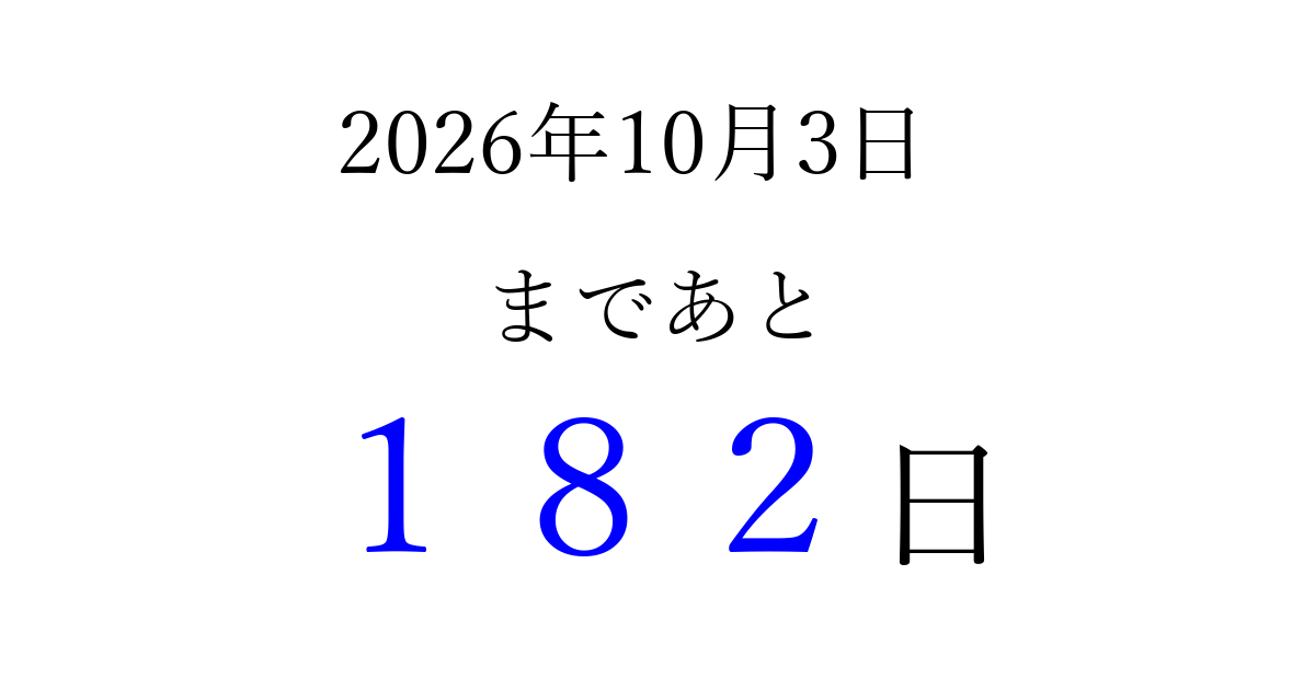 2026年10月3日(土)まで あと 999 日です 追加すると、トップページからすぐ選べるようになります ※2026/04/04現在の結果です。 最新の状態に更新する ↓シェアして、タイムライン上にカウントダウンを表示しよう!↓ 📤 この結果を共有する Tweet シェア Threads Bluesky 別の日付でカウントダウン 2026年10月のカレンダー このページをブックマークに追加すると、いつでもカウントダウンを確認できます。 (PC: Ctrl+D / Mac: ⌘+D) hitome-notes.comでは以下のページも運営しています。 指定日と期間から日付を計算 | ガチャ確率計算・シミュレーション | プライバシー・ポリシー 運営者:Avocado