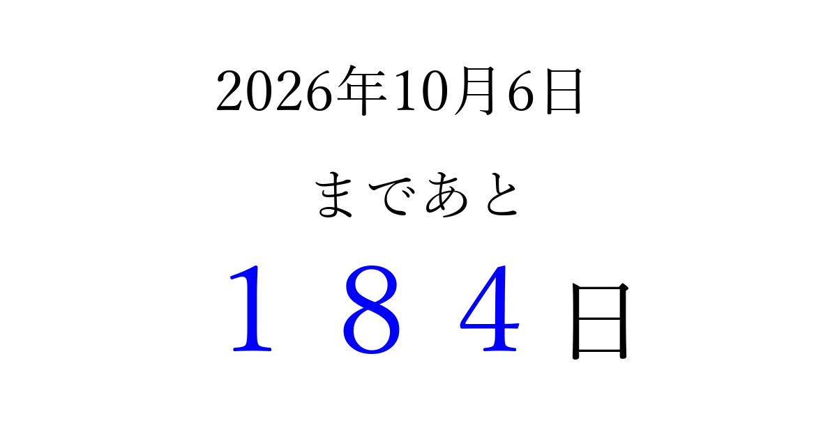 2026年10月6日(火)まで あと 999 日です 追加すると、トップページからすぐ選べるようになります ※2026/04/05現在の結果です。 最新の状態に更新する ↓シェアして、タイムライン上にカウントダウンを表示しよう!↓ 📤 この結果を共有する Tweet シェア Threads Bluesky 別の日付でカウントダウン 2026年10月のカレンダー このページをブックマークに追加すると、いつでもカウントダウンを確認できます。 (PC: Ctrl+D / Mac: ⌘+D) hitome-notes.comでは以下のページも運営しています。 指定日と期間から日付を計算 | ガチャ確率計算・シミュレーション | プライバシー・ポリシー 運営者:Avocado