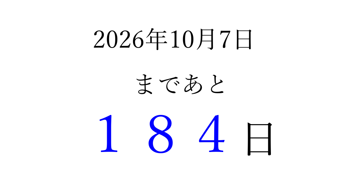 2026年10月7日(水)まで あと 999 日です 追加すると、トップページからすぐ選べるようになります ※2026/04/06現在の結果です。 最新の状態に更新する ↓シェアして、タイムライン上にカウントダウンを表示しよう!↓ 📤 この結果を共有する Tweet シェア Threads Bluesky 別の日付でカウントダウン 2026年10月のカレンダー このページをブックマークに追加すると、いつでもカウントダウンを確認できます。 (PC: Ctrl+D / Mac: ⌘+D) hitome-notes.comでは以下のページも運営しています。 指定日と期間から日付を計算 | ガチャ確率計算・シミュレーション | プライバシー・ポリシー 運営者:Avocado