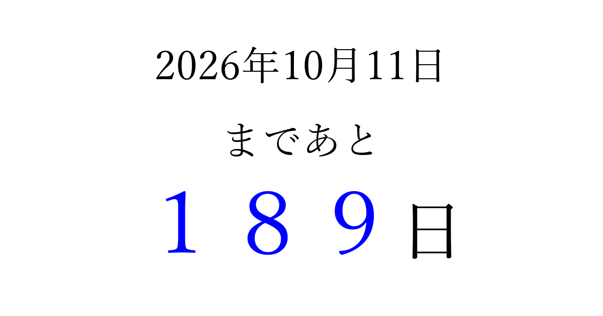 2026年10月11日(日)まで あと 999 日です 追加すると、トップページからすぐ選べるようになります ※2026/04/05現在の結果です。 最新の状態に更新する ↓シェアして、タイムライン上にカウントダウンを表示しよう!↓ 📤 この結果を共有する Tweet シェア Threads Bluesky 別の日付でカウントダウン 2026年10月のカレンダー このページをブックマークに追加すると、いつでもカウントダウンを確認できます。 (PC: Ctrl+D / Mac: ⌘+D) hitome-notes.comでは以下のページも運営しています。 指定日と期間から日付を計算 | ガチャ確率計算・シミュレーション | プライバシー・ポリシー 運営者:Avocado