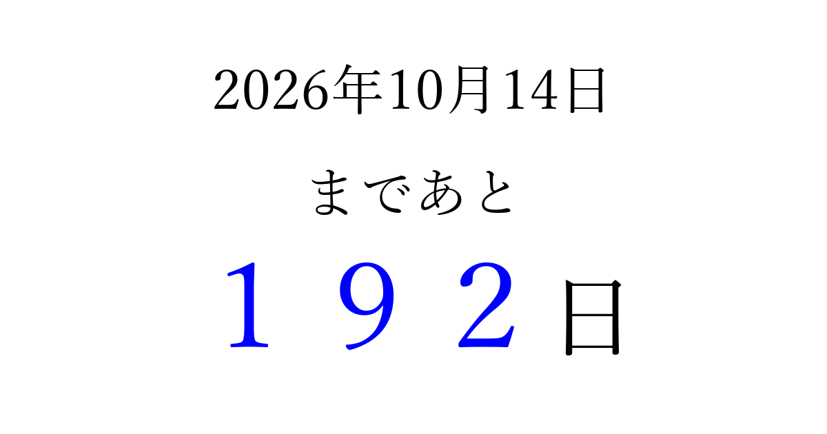 2026年10月14日(水)まで あと 999 日です 追加すると、トップページからすぐ選べるようになります ※2026/04/05現在の結果です。 最新の状態に更新する ↓シェアして、タイムライン上にカウントダウンを表示しよう!↓ 📤 この結果を共有する Tweet シェア Threads Bluesky 別の日付でカウントダウン 2026年10月のカレンダー このページをブックマークに追加すると、いつでもカウントダウンを確認できます。 (PC: Ctrl+D / Mac: ⌘+D) hitome-notes.comでは以下のページも運営しています。 指定日と期間から日付を計算 | ガチャ確率計算・シミュレーション | プライバシー・ポリシー 運営者:Avocado
