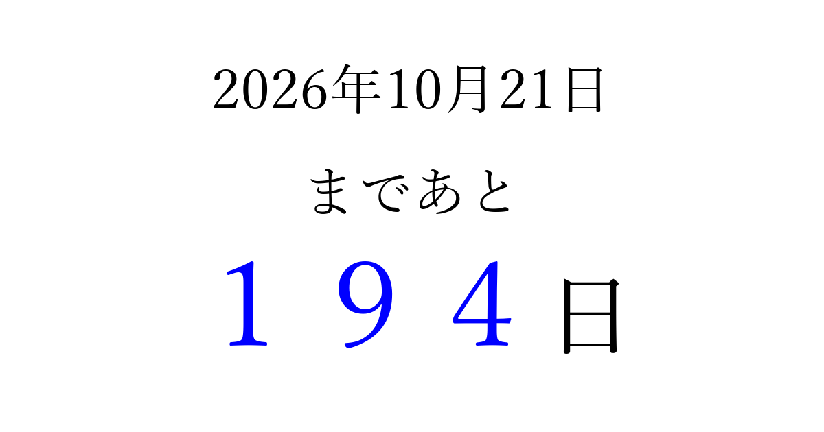 2026年10月21日(水)まで あと 999 日です 追加すると、トップページからすぐ選べるようになります ※2026/04/10現在の結果です。 最新の状態に更新する ↓シェアして、タイムライン上にカウントダウンを表示しよう!↓ 📤 この結果を共有する Tweet シェア Threads Bluesky 別の日付でカウントダウン 2026年10月のカレンダー このページをブックマークに追加すると、いつでもカウントダウンを確認できます。 (PC: Ctrl+D / Mac: ⌘+D) hitome-notes.comでは以下のページも運営しています。 指定日と期間から日付を計算 | ガチャ確率計算・シミュレーション | プライバシー・ポリシー 運営者:Avocado