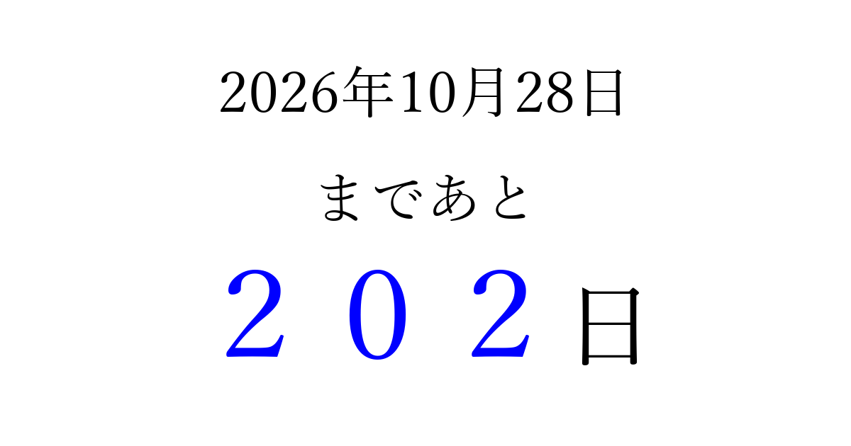 2026年10月28日(水)まで あと 999 日です 追加すると、トップページからすぐ選べるようになります ※2026/04/09現在の結果です。 最新の状態に更新する ↓シェアして、タイムライン上にカウントダウンを表示しよう!↓ 📤 この結果を共有する Tweet シェア Threads Bluesky 別の日付でカウントダウン 2026年10月のカレンダー このページをブックマークに追加すると、いつでもカウントダウンを確認できます。 (PC: Ctrl+D / Mac: ⌘+D) hitome-notes.comでは以下のページも運営しています。 指定日と期間から日付を計算 | ガチャ確率計算・シミュレーション | プライバシー・ポリシー 運営者:Avocado