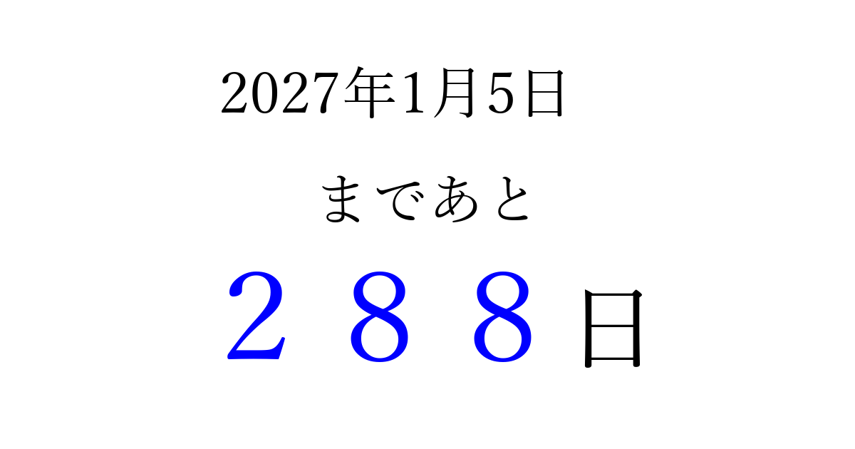 2027年1月5日(火)まで あと 999 日です 追加すると、トップページからすぐ選べるようになります ※2026/03/23現在の結果です。 最新の状態に更新する ↓シェアして、タイムライン上にカウントダウンを表示しよう!↓ 📤 この結果を共有する Tweet シェア Threads Bluesky 別の日付でカウントダウン 2027年1月のカレンダー このページをブックマークに追加すると、いつでもカウントダウンを確認できます。 (PC: Ctrl+D / Mac: ⌘+D) hitome-notes.comでは以下のページも運営しています。 指定日と期間から日付を計算 | ガチャ確率計算・シミュレーション | プライバシー・ポリシー 運営者:Avocado