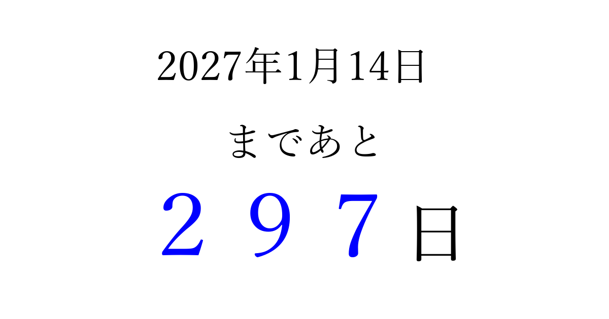 2027年1月14日(木)まで あと 999 日です 追加すると、トップページからすぐ選べるようになります ※2026/03/23現在の結果です。 最新の状態に更新する ↓シェアして、タイムライン上にカウントダウンを表示しよう!↓ 📤 この結果を共有する Tweet シェア Threads Bluesky 別の日付でカウントダウン 2027年1月のカレンダー このページをブックマークに追加すると、いつでもカウントダウンを確認できます。 (PC: Ctrl+D / Mac: ⌘+D) hitome-notes.comでは以下のページも運営しています。 指定日と期間から日付を計算 | ガチャ確率計算・シミュレーション | プライバシー・ポリシー 運営者:Avocado