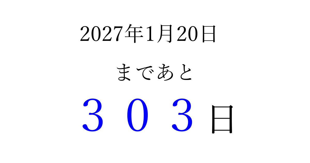 2027年1月20日(水)まで あと 999 日です 追加すると、トップページからすぐ選べるようになります ※2026/03/23現在の結果です。 最新の状態に更新する ↓シェアして、タイムライン上にカウントダウンを表示しよう!↓ 📤 この結果を共有する Tweet シェア Threads Bluesky 別の日付でカウントダウン 2027年1月のカレンダー このページをブックマークに追加すると、いつでもカウントダウンを確認できます。 (PC: Ctrl+D / Mac: ⌘+D) hitome-notes.comでは以下のページも運営しています。 指定日と期間から日付を計算 | ガチャ確率計算・シミュレーション | プライバシー・ポリシー 運営者:Avocado