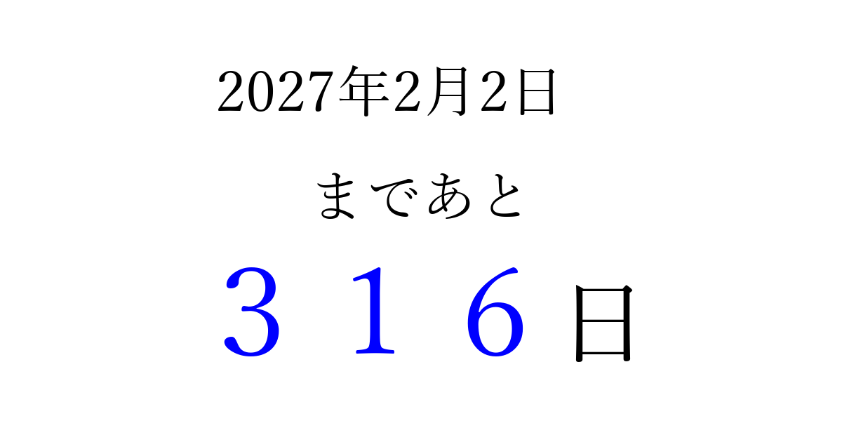 2027年2月2日(火)まで あと 999 日です 追加すると、トップページからすぐ選べるようになります ※2026/03/23現在の結果です。 最新の状態に更新する ↓シェアして、タイムライン上にカウントダウンを表示しよう!↓ 📤 この結果を共有する Tweet シェア Threads Bluesky 別の日付でカウントダウン 2027年2月のカレンダー このページをブックマークに追加すると、いつでもカウントダウンを確認できます。 (PC: Ctrl+D / Mac: ⌘+D) hitome-notes.comでは以下のページも運営しています。 指定日と期間から日付を計算 | ガチャ確率計算・シミュレーション | プライバシー・ポリシー 運営者:Avocado
