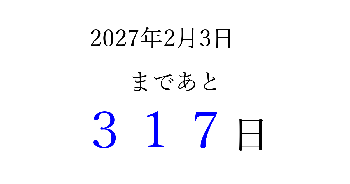 2027年2月3日(水)まで あと 999 日です 追加すると、トップページからすぐ選べるようになります ※2026/03/23現在の結果です。 最新の状態に更新する ↓シェアして、タイムライン上にカウントダウンを表示しよう!↓ 📤 この結果を共有する Tweet シェア Threads Bluesky 別の日付でカウントダウン 2027年2月のカレンダー このページをブックマークに追加すると、いつでもカウントダウンを確認できます。 (PC: Ctrl+D / Mac: ⌘+D) hitome-notes.comでは以下のページも運営しています。 指定日と期間から日付を計算 | ガチャ確率計算・シミュレーション | プライバシー・ポリシー 運営者:Avocado