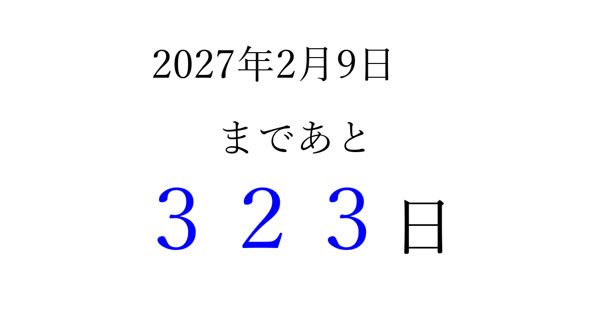 2027年2月9日(火)まで あと 999 日です 追加すると、トップページからすぐ選べるようになります ※2026/03/23現在の結果です。 最新の状態に更新する ↓シェアして、タイムライン上にカウントダウンを表示しよう!↓ 📤 この結果を共有する Tweet シェア Threads Bluesky 別の日付でカウントダウン 2027年2月のカレンダー このページをブックマークに追加すると、いつでもカウントダウンを確認できます。 (PC: Ctrl+D / Mac: ⌘+D) hitome-notes.comでは以下のページも運営しています。 指定日と期間から日付を計算 | ガチャ確率計算・シミュレーション | プライバシー・ポリシー 運営者:Avocado