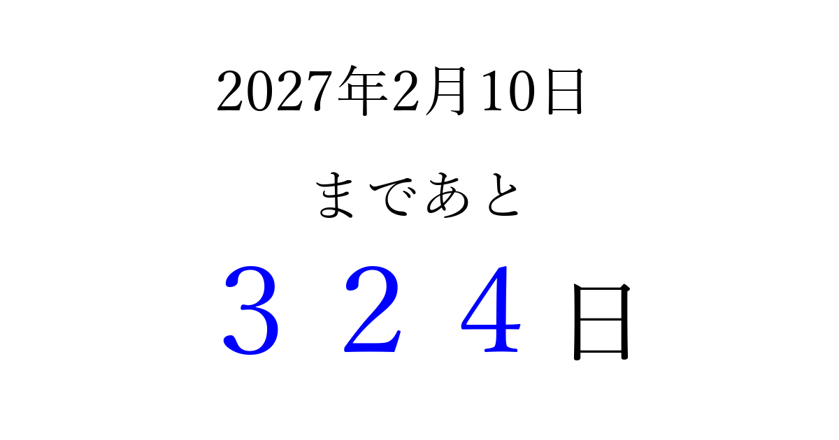 2027年2月10日(水)まで あと 999 日です 追加すると、トップページからすぐ選べるようになります ※2026/03/23現在の結果です。 最新の状態に更新する ↓シェアして、タイムライン上にカウントダウンを表示しよう!↓ 📤 この結果を共有する Tweet シェア Threads Bluesky 別の日付でカウントダウン 2027年2月のカレンダー このページをブックマークに追加すると、いつでもカウントダウンを確認できます。 (PC: Ctrl+D / Mac: ⌘+D) hitome-notes.comでは以下のページも運営しています。 指定日と期間から日付を計算 | ガチャ確率計算・シミュレーション | プライバシー・ポリシー 運営者:Avocado