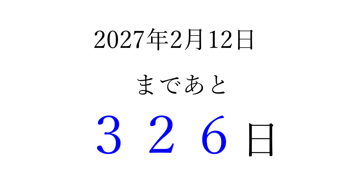 2027年2月12日(金)まで あと 999 日です 追加すると、トップページからすぐ選べるようになります ※2026/03/23現在の結果です。 最新の状態に更新する ↓シェアして、タイムライン上にカウントダウンを表示しよう!↓ 📤 この結果を共有する Tweet シェア Threads Bluesky 別の日付でカウントダウン 2027年2月のカレンダー このページをブックマークに追加すると、いつでもカウントダウンを確認できます。 (PC: Ctrl+D / Mac: ⌘+D) hitome-notes.comでは以下のページも運営しています。 指定日と期間から日付を計算 | ガチャ確率計算・シミュレーション | プライバシー・ポリシー 運営者:Avocado