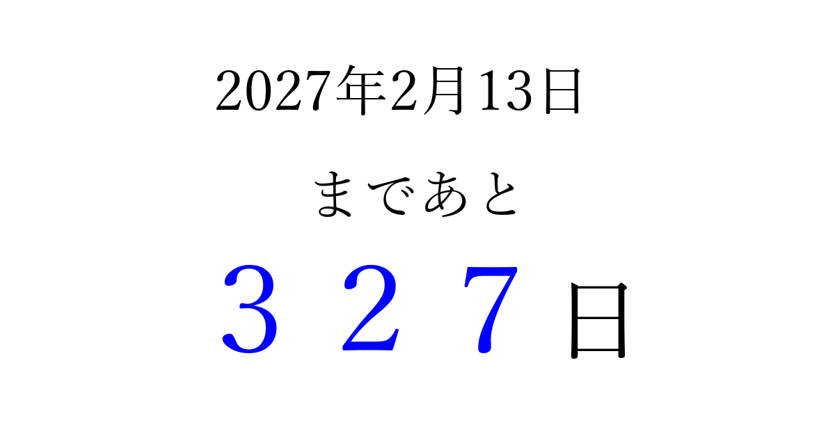 2027年2月13日(土)まで あと 999 日です 追加すると、トップページからすぐ選べるようになります ※2026/03/23現在の結果です。 最新の状態に更新する ↓シェアして、タイムライン上にカウントダウンを表示しよう!↓ 📤 この結果を共有する Tweet シェア Threads Bluesky 別の日付でカウントダウン 2027年2月のカレンダー このページをブックマークに追加すると、いつでもカウントダウンを確認できます。 (PC: Ctrl+D / Mac: ⌘+D) hitome-notes.comでは以下のページも運営しています。 指定日と期間から日付を計算 | ガチャ確率計算・シミュレーション | プライバシー・ポリシー 運営者:Avocado
