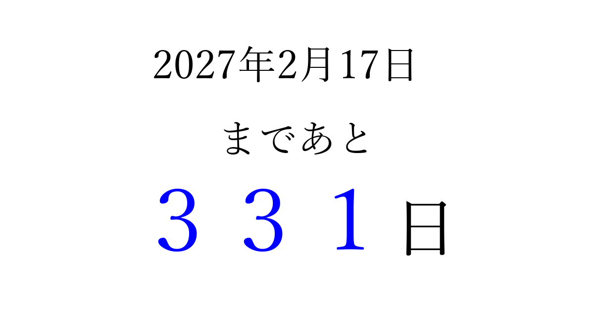 2027年2月17日(水)まで あと 999 日です 追加すると、トップページからすぐ選べるようになります ※2026/03/23現在の結果です。 最新の状態に更新する ↓シェアして、タイムライン上にカウントダウンを表示しよう!↓ 📤 この結果を共有する Tweet シェア Threads Bluesky 別の日付でカウントダウン 2027年2月のカレンダー このページをブックマークに追加すると、いつでもカウントダウンを確認できます。 (PC: Ctrl+D / Mac: ⌘+D) hitome-notes.comでは以下のページも運営しています。 指定日と期間から日付を計算 | ガチャ確率計算・シミュレーション | プライバシー・ポリシー 運営者:Avocado