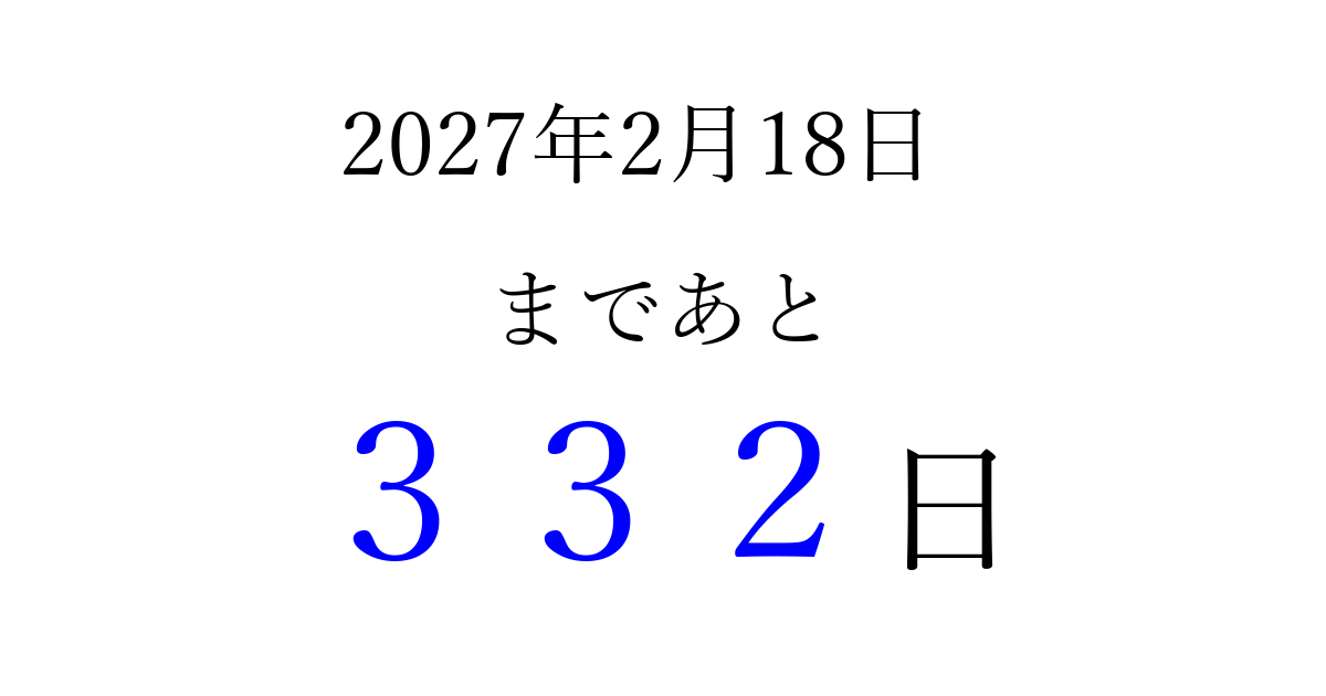 2027年2月18日(木)まで あと 999 日です 追加すると、トップページからすぐ選べるようになります ※2026/03/23現在の結果です。 最新の状態に更新する ↓シェアして、タイムライン上にカウントダウンを表示しよう!↓ 📤 この結果を共有する Tweet シェア Threads Bluesky 別の日付でカウントダウン 2027年2月のカレンダー このページをブックマークに追加すると、いつでもカウントダウンを確認できます。 (PC: Ctrl+D / Mac: ⌘+D) hitome-notes.comでは以下のページも運営しています。 指定日と期間から日付を計算 | ガチャ確率計算・シミュレーション | プライバシー・ポリシー 運営者:Avocado