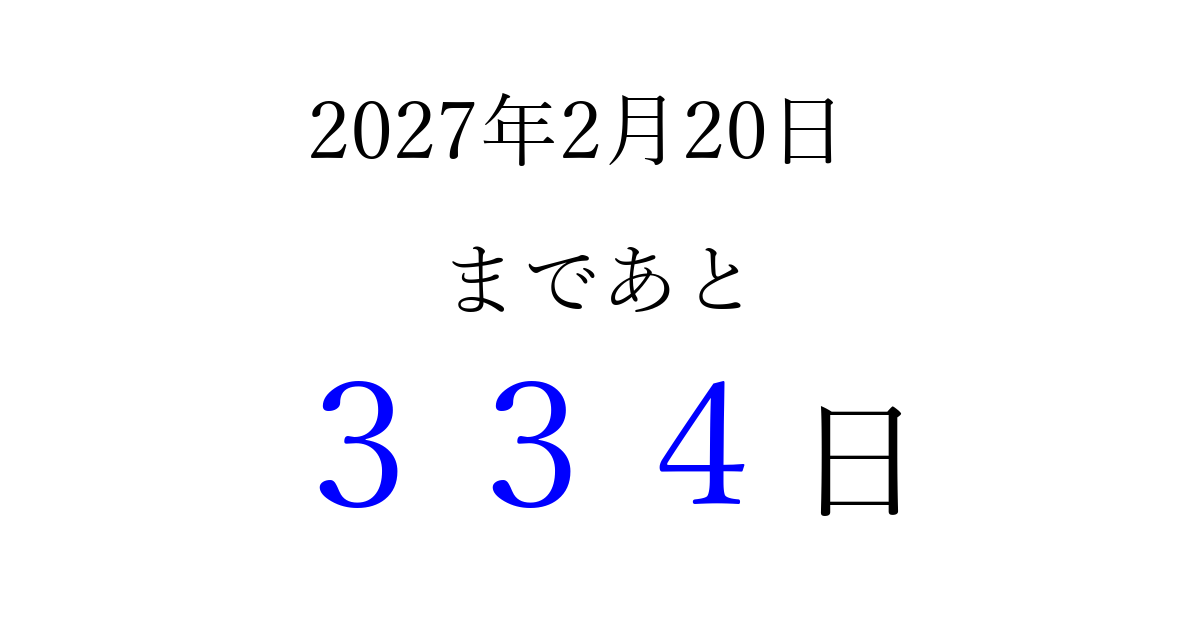 2027年2月20日(土)まで あと 999 日です 追加すると、トップページからすぐ選べるようになります ※2026/03/23現在の結果です。 最新の状態に更新する ↓シェアして、タイムライン上にカウントダウンを表示しよう!↓ 📤 この結果を共有する Tweet シェア Threads Bluesky 別の日付でカウントダウン 2027年2月のカレンダー このページをブックマークに追加すると、いつでもカウントダウンを確認できます。 (PC: Ctrl+D / Mac: ⌘+D) hitome-notes.comでは以下のページも運営しています。 指定日と期間から日付を計算 | ガチャ確率計算・シミュレーション | プライバシー・ポリシー 運営者:Avocado