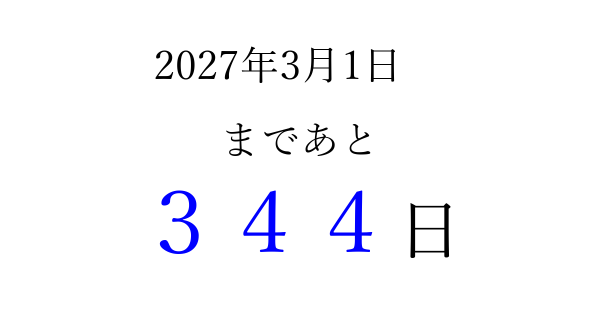 2027年3月1日(月)まで あと 999 日です 追加すると、トップページからすぐ選べるようになります ※2026/03/22現在の結果です。 最新の状態に更新する ↓シェアして、タイムライン上にカウントダウンを表示しよう!↓ 📤 この結果を共有する Tweet シェア Threads Bluesky 別の日付でカウントダウン 2027年3月のカレンダー このページをブックマークに追加すると、いつでもカウントダウンを確認できます。 (PC: Ctrl+D / Mac: ⌘+D) hitome-notes.comでは以下のページも運営しています。 指定日と期間から日付を計算 | ガチャ確率計算・シミュレーション | プライバシー・ポリシー 運営者:Avocado