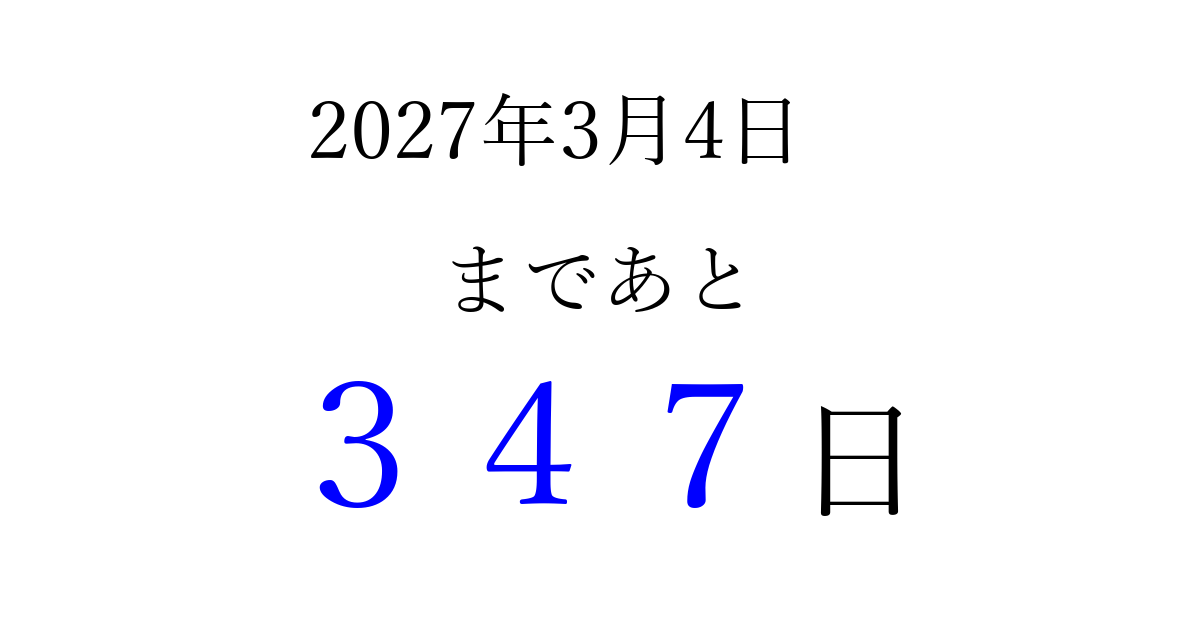 2027年3月4日(木)まで あと 999 日です 追加すると、トップページからすぐ選べるようになります ※2026/03/22現在の結果です。 最新の状態に更新する ↓シェアして、タイムライン上にカウントダウンを表示しよう!↓ 📤 この結果を共有する Tweet シェア Threads Bluesky 別の日付でカウントダウン 2027年3月のカレンダー このページをブックマークに追加すると、いつでもカウントダウンを確認できます。 (PC: Ctrl+D / Mac: ⌘+D) hitome-notes.comでは以下のページも運営しています。 指定日と期間から日付を計算 | ガチャ確率計算・シミュレーション | プライバシー・ポリシー 運営者:Avocado