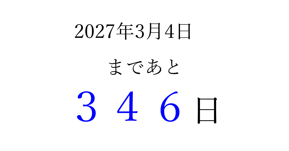 2027年3月4日(木)まで あと 999 日です 追加すると、トップページからすぐ選べるようになります ※2026/03/23現在の結果です。 最新の状態に更新する ↓シェアして、タイムライン上にカウントダウンを表示しよう!↓ 📤 この結果を共有する Tweet シェア Threads Bluesky 別の日付でカウントダウン 2027年3月のカレンダー このページをブックマークに追加すると、いつでもカウントダウンを確認できます。 (PC: Ctrl+D / Mac: ⌘+D) hitome-notes.comでは以下のページも運営しています。 指定日と期間から日付を計算 | ガチャ確率計算・シミュレーション | プライバシー・ポリシー 運営者:Avocado