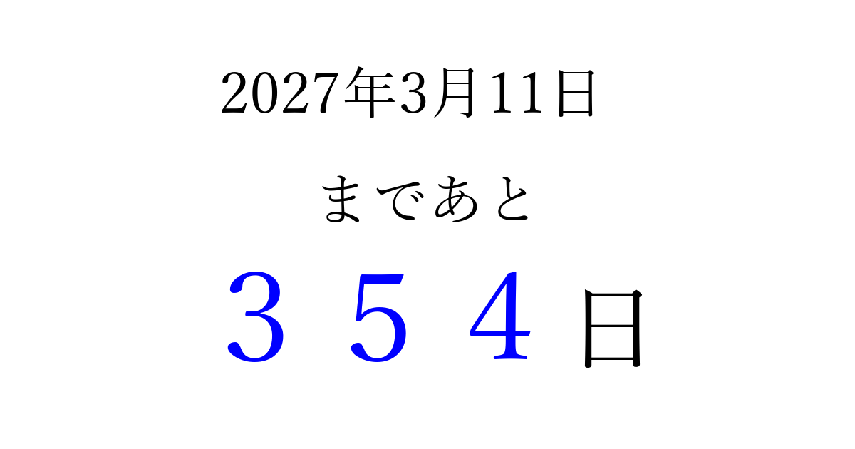 2027年3月11日(木)まで あと 999 日です 追加すると、トップページからすぐ選べるようになります ※2026/03/22現在の結果です。 最新の状態に更新する ↓シェアして、タイムライン上にカウントダウンを表示しよう!↓ 📤 この結果を共有する Tweet シェア Threads Bluesky 別の日付でカウントダウン 2027年3月のカレンダー このページをブックマークに追加すると、いつでもカウントダウンを確認できます。 (PC: Ctrl+D / Mac: ⌘+D) hitome-notes.comでは以下のページも運営しています。 指定日と期間から日付を計算 | ガチャ確率計算・シミュレーション | プライバシー・ポリシー 運営者:Avocado