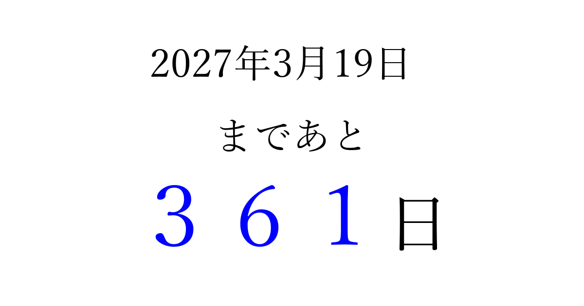 2027年3月19日(金)まで あと 999 日です 追加すると、トップページからすぐ選べるようになります ※2026/03/23現在の結果です。 最新の状態に更新する ↓シェアして、タイムライン上にカウントダウンを表示しよう!↓ 📤 この結果を共有する Tweet シェア Threads Bluesky 別の日付でカウントダウン 2027年3月のカレンダー このページをブックマークに追加すると、いつでもカウントダウンを確認できます。 (PC: Ctrl+D / Mac: ⌘+D) hitome-notes.comでは以下のページも運営しています。 指定日と期間から日付を計算 | ガチャ確率計算・シミュレーション | プライバシー・ポリシー 運営者:Avocado