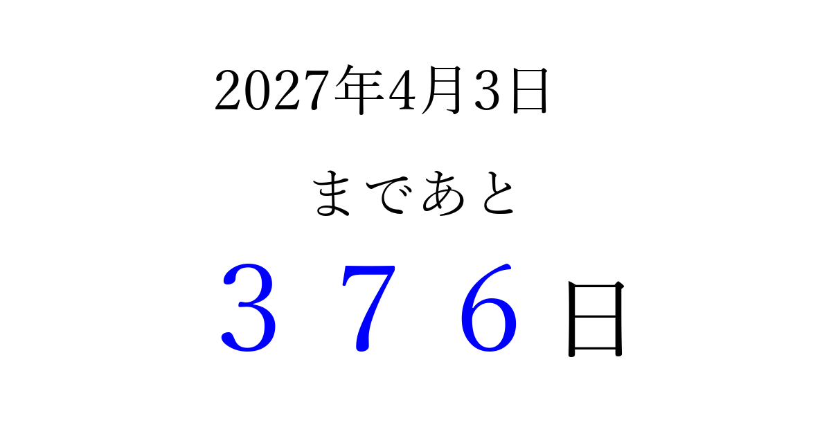 2027年4月3日(土)まで あと 999 日です 追加すると、トップページからすぐ選べるようになります ※2026/03/23現在の結果です。 最新の状態に更新する ↓シェアして、タイムライン上にカウントダウンを表示しよう!↓ 📤 この結果を共有する Tweet シェア Threads Bluesky 別の日付でカウントダウン 2027年4月のカレンダー このページをブックマークに追加すると、いつでもカウントダウンを確認できます。 (PC: Ctrl+D / Mac: ⌘+D) hitome-notes.comでは以下のページも運営しています。 指定日と期間から日付を計算 | ガチャ確率計算・シミュレーション | プライバシー・ポリシー 運営者:Avocado