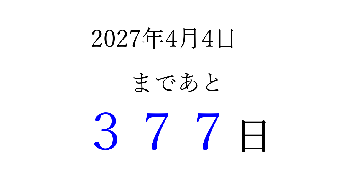 2027年4月4日(日)まで あと 999 日です 追加すると、トップページからすぐ選べるようになります ※2026/03/23現在の結果です。 最新の状態に更新する ↓シェアして、タイムライン上にカウントダウンを表示しよう!↓ 📤 この結果を共有する Tweet シェア Threads Bluesky 別の日付でカウントダウン 2027年4月のカレンダー このページをブックマークに追加すると、いつでもカウントダウンを確認できます。 (PC: Ctrl+D / Mac: ⌘+D) hitome-notes.comでは以下のページも運営しています。 指定日と期間から日付を計算 | ガチャ確率計算・シミュレーション | プライバシー・ポリシー 運営者:Avocado