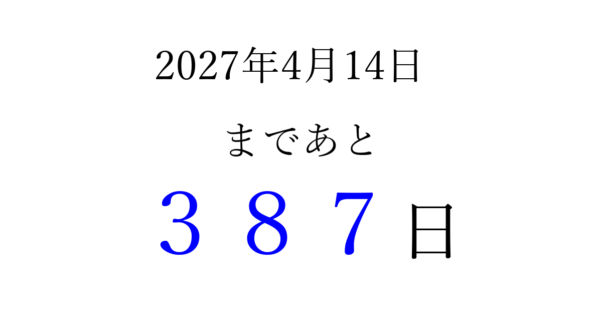 2027年4月14日(水)まで あと 999 日です 追加すると、トップページからすぐ選べるようになります ※2026/03/23現在の結果です。 最新の状態に更新する ↓シェアして、タイムライン上にカウントダウンを表示しよう!↓ 📤 この結果を共有する Tweet シェア Threads Bluesky 別の日付でカウントダウン 2027年4月のカレンダー このページをブックマークに追加すると、いつでもカウントダウンを確認できます。 (PC: Ctrl+D / Mac: ⌘+D) hitome-notes.comでは以下のページも運営しています。 指定日と期間から日付を計算 | ガチャ確率計算・シミュレーション | プライバシー・ポリシー 運営者:Avocado