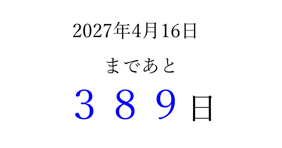 2027年4月16日(金)まで あと 999 日です 追加すると、トップページからすぐ選べるようになります ※2026/03/23現在の結果です。 最新の状態に更新する ↓シェアして、タイムライン上にカウントダウンを表示しよう!↓ 📤 この結果を共有する Tweet シェア Threads Bluesky 別の日付でカウントダウン 2027年4月のカレンダー このページをブックマークに追加すると、いつでもカウントダウンを確認できます。 (PC: Ctrl+D / Mac: ⌘+D) hitome-notes.comでは以下のページも運営しています。 指定日と期間から日付を計算 | ガチャ確率計算・シミュレーション | プライバシー・ポリシー 運営者:Avocado