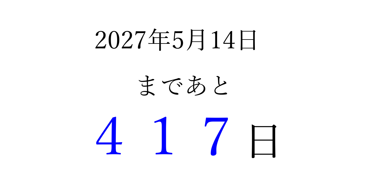2027年5月14日(金)まで あと 999 日です 追加すると、トップページからすぐ選べるようになります ※2026/03/23現在の結果です。 最新の状態に更新する ↓シェアして、タイムライン上にカウントダウンを表示しよう!↓ 📤 この結果を共有する Tweet シェア Threads Bluesky 別の日付でカウントダウン 2027年5月のカレンダー このページをブックマークに追加すると、いつでもカウントダウンを確認できます。 (PC: Ctrl+D / Mac: ⌘+D) hitome-notes.comでは以下のページも運営しています。 指定日と期間から日付を計算 | ガチャ確率計算・シミュレーション | プライバシー・ポリシー 運営者:Avocado