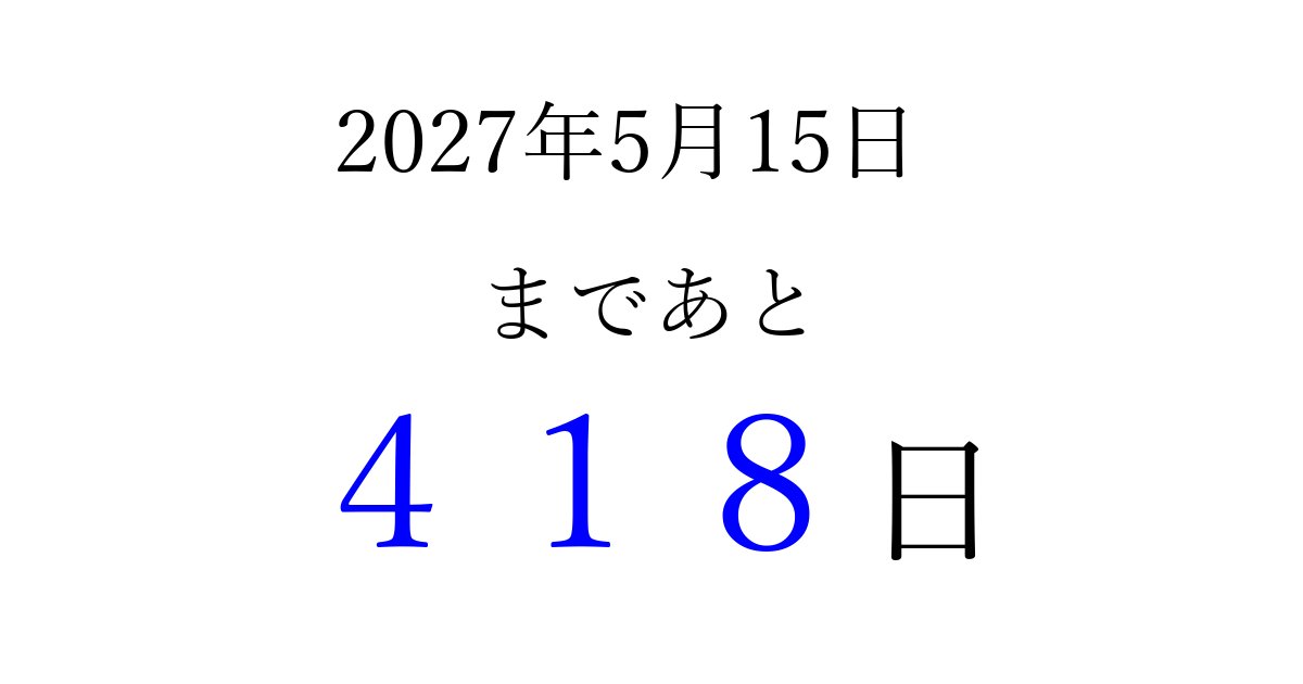 2027年5月15日(土)まで あと 999 日です 追加すると、トップページからすぐ選べるようになります ※2026/03/23現在の結果です。 最新の状態に更新する ↓シェアして、タイムライン上にカウントダウンを表示しよう!↓ 📤 この結果を共有する Tweet シェア Threads Bluesky 別の日付でカウントダウン 2027年5月のカレンダー このページをブックマークに追加すると、いつでもカウントダウンを確認できます。 (PC: Ctrl+D / Mac: ⌘+D) hitome-notes.comでは以下のページも運営しています。 指定日と期間から日付を計算 | ガチャ確率計算・シミュレーション | プライバシー・ポリシー 運営者:Avocado