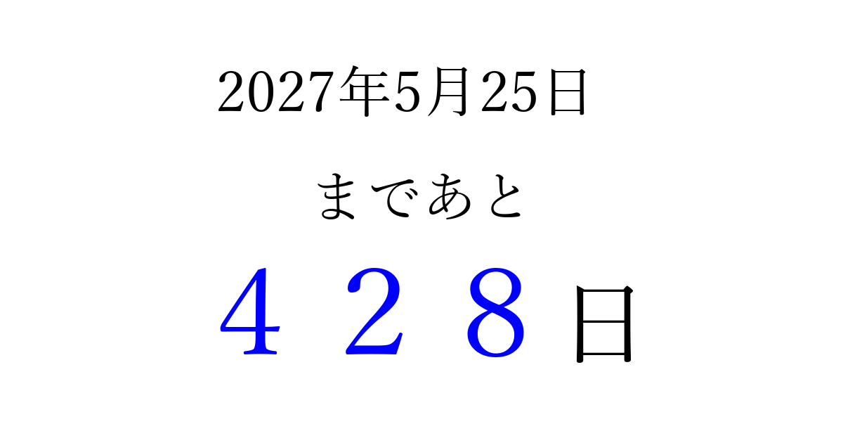 2027年5月25日(火)まで あと 999 日です 追加すると、トップページからすぐ選べるようになります ※2026/03/23現在の結果です。 最新の状態に更新する ↓シェアして、タイムライン上にカウントダウンを表示しよう!↓ 📤 この結果を共有する Tweet シェア Threads Bluesky 別の日付でカウントダウン 2027年5月のカレンダー このページをブックマークに追加すると、いつでもカウントダウンを確認できます。 (PC: Ctrl+D / Mac: ⌘+D) hitome-notes.comでは以下のページも運営しています。 指定日と期間から日付を計算 | ガチャ確率計算・シミュレーション | プライバシー・ポリシー 運営者:Avocado