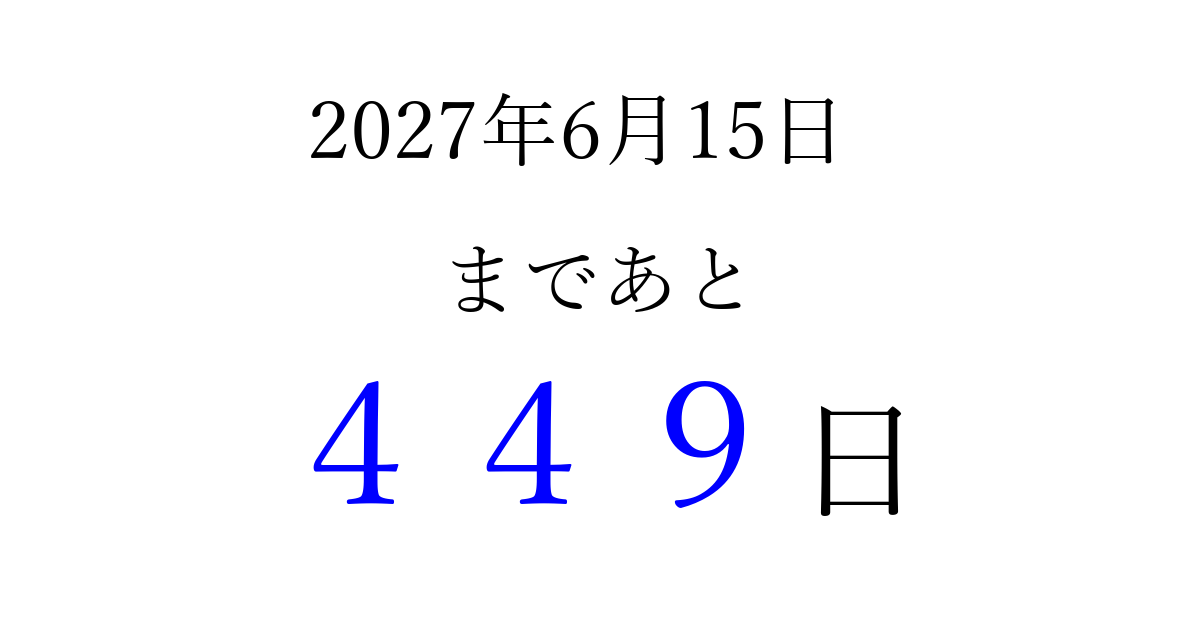 2027年6月15日(火)まで あと 999 日です 追加すると、トップページからすぐ選べるようになります ※2026/03/23現在の結果です。 最新の状態に更新する ↓シェアして、タイムライン上にカウントダウンを表示しよう!↓ 📤 この結果を共有する Tweet シェア Threads Bluesky 別の日付でカウントダウン 2027年6月のカレンダー このページをブックマークに追加すると、いつでもカウントダウンを確認できます。 (PC: Ctrl+D / Mac: ⌘+D) hitome-notes.comでは以下のページも運営しています。 指定日と期間から日付を計算 | ガチャ確率計算・シミュレーション | プライバシー・ポリシー 運営者:Avocado