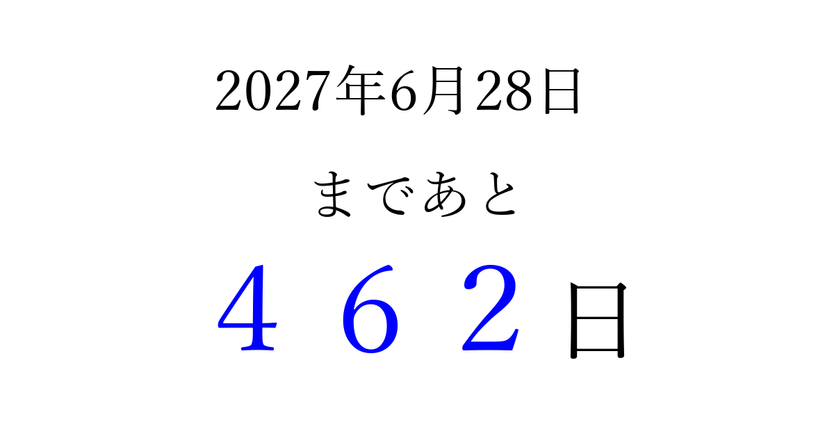 2027年6月28日(月)まで あと 999 日です 追加すると、トップページからすぐ選べるようになります ※2026/03/23現在の結果です。 最新の状態に更新する ↓シェアして、タイムライン上にカウントダウンを表示しよう!↓ 📤 この結果を共有する Tweet シェア Threads Bluesky 別の日付でカウントダウン 2027年6月のカレンダー このページをブックマークに追加すると、いつでもカウントダウンを確認できます。 (PC: Ctrl+D / Mac: ⌘+D) hitome-notes.comでは以下のページも運営しています。 指定日と期間から日付を計算 | ガチャ確率計算・シミュレーション | プライバシー・ポリシー 運営者:Avocado