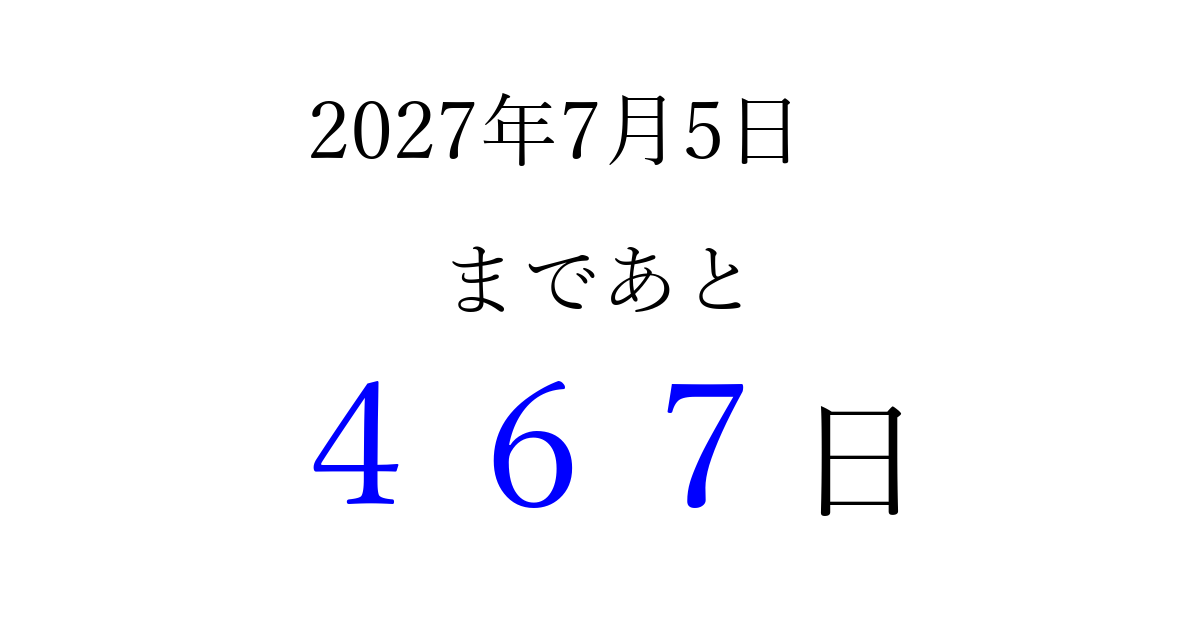 2027年7月5日(月)まで あと 999 日です 追加すると、トップページからすぐ選べるようになります ※2026/03/25現在の結果です。 最新の状態に更新する ↓シェアして、タイムライン上にカウントダウンを表示しよう!↓ 📤 この結果を共有する Tweet シェア Threads Bluesky 別の日付でカウントダウン 2027年7月のカレンダー このページをブックマークに追加すると、いつでもカウントダウンを確認できます。 (PC: Ctrl+D / Mac: ⌘+D) hitome-notes.comでは以下のページも運営しています。 指定日と期間から日付を計算 | ガチャ確率計算・シミュレーション | プライバシー・ポリシー 運営者:Avocado