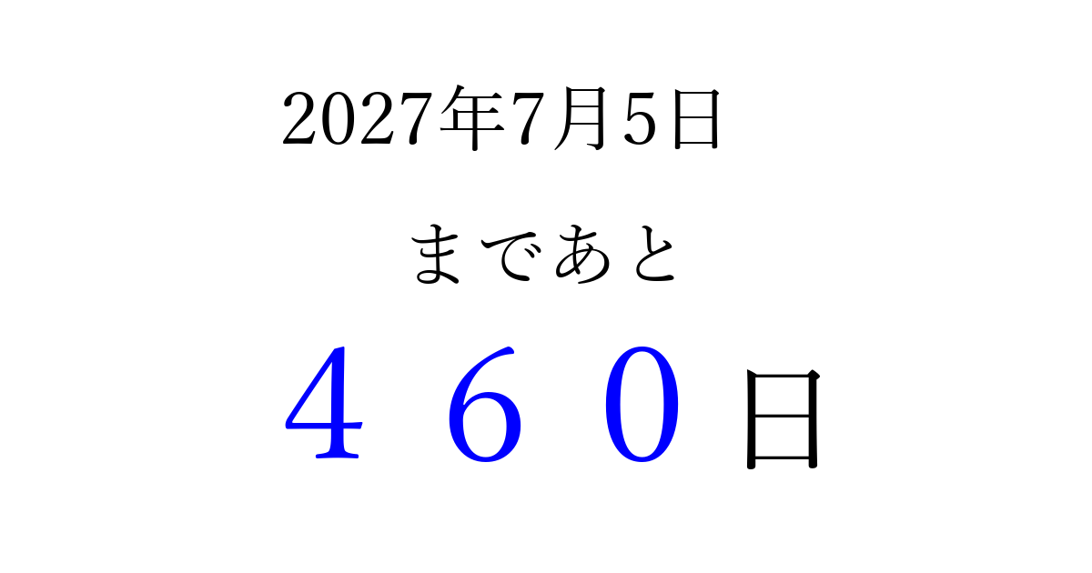 2027年7月5日(月)まで あと 999 日です 追加すると、トップページからすぐ選べるようになります ※2026/04/01現在の結果です。 最新の状態に更新する ↓シェアして、タイムライン上にカウントダウンを表示しよう!↓ 📤 この結果を共有する Tweet シェア Threads Bluesky 別の日付でカウントダウン 2027年7月のカレンダー このページをブックマークに追加すると、いつでもカウントダウンを確認できます。 (PC: Ctrl+D / Mac: ⌘+D) hitome-notes.comでは以下のページも運営しています。 指定日と期間から日付を計算 | ガチャ確率計算・シミュレーション | プライバシー・ポリシー 運営者:Avocado