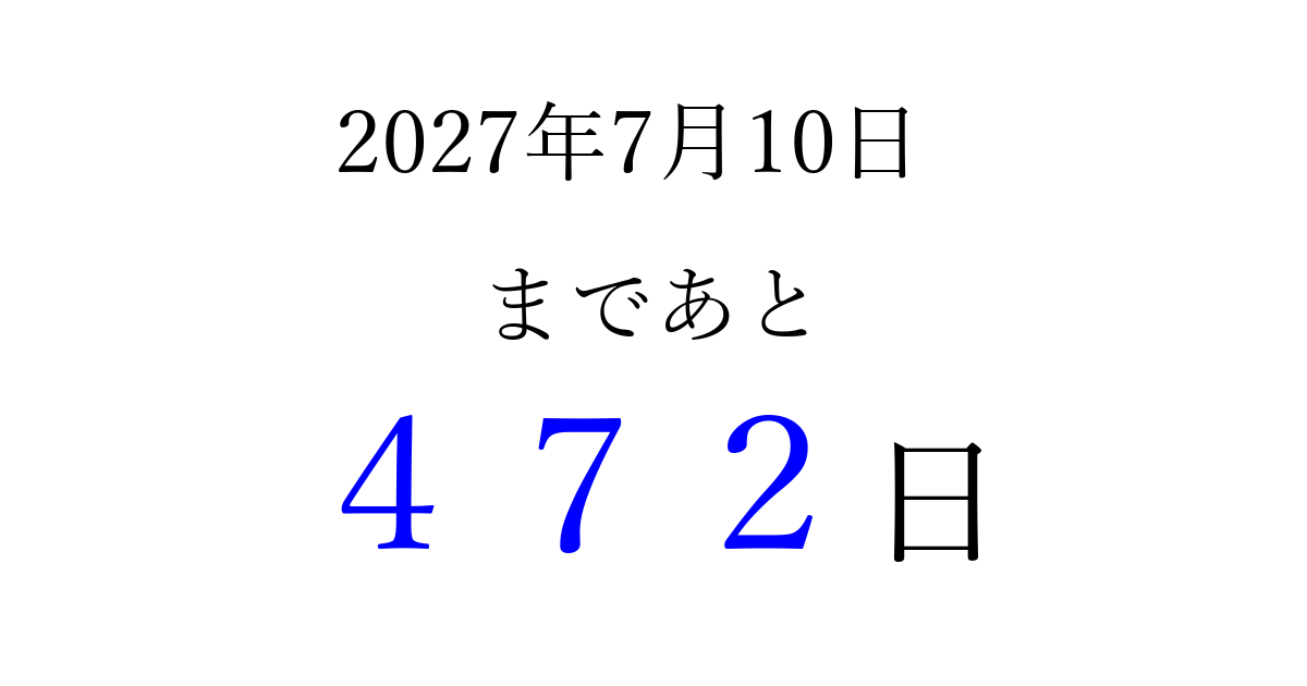 2027年7月10日(土)まで あと 999 日です 追加すると、トップページからすぐ選べるようになります ※2026/03/25現在の結果です。 最新の状態に更新する ↓シェアして、タイムライン上にカウントダウンを表示しよう!↓ 📤 この結果を共有する Tweet シェア Threads Bluesky 別の日付でカウントダウン 2027年7月のカレンダー このページをブックマークに追加すると、いつでもカウントダウンを確認できます。 (PC: Ctrl+D / Mac: ⌘+D) hitome-notes.comでは以下のページも運営しています。 指定日と期間から日付を計算 | ガチャ確率計算・シミュレーション | プライバシー・ポリシー 運営者:Avocado