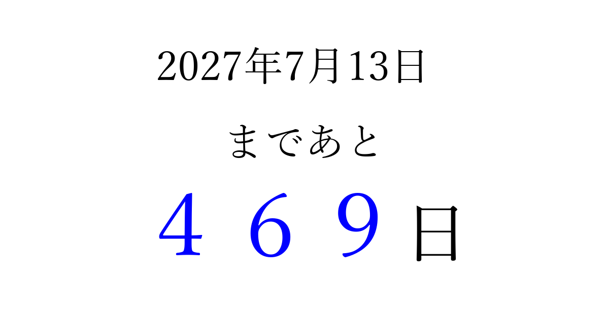 2027年7月13日(火)まで あと 999 日です 追加すると、トップページからすぐ選べるようになります ※2026/03/31現在の結果です。 最新の状態に更新する ↓シェアして、タイムライン上にカウントダウンを表示しよう!↓ 📤 この結果を共有する Tweet シェア Threads Bluesky 別の日付でカウントダウン 2027年7月のカレンダー このページをブックマークに追加すると、いつでもカウントダウンを確認できます。 (PC: Ctrl+D / Mac: ⌘+D) hitome-notes.comでは以下のページも運営しています。 指定日と期間から日付を計算 | ガチャ確率計算・シミュレーション | プライバシー・ポリシー 運営者:Avocado
