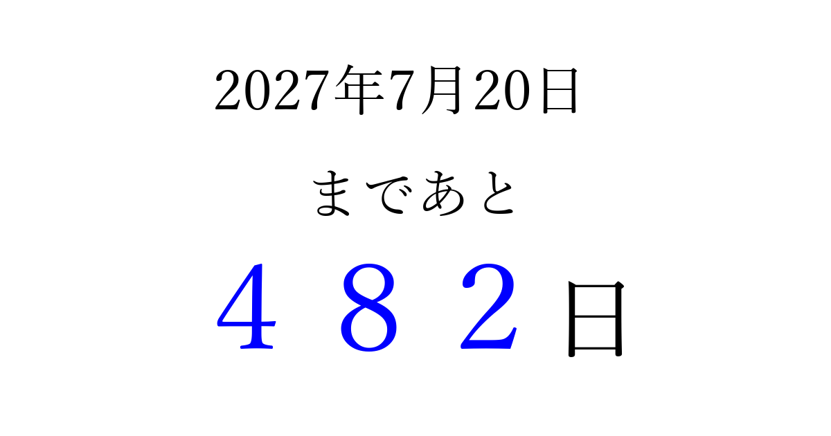 2027年7月20日(火)まで あと 999 日です 追加すると、トップページからすぐ選べるようになります ※2026/03/25現在の結果です。 最新の状態に更新する ↓シェアして、タイムライン上にカウントダウンを表示しよう!↓ 📤 この結果を共有する Tweet シェア Threads Bluesky 別の日付でカウントダウン 2027年7月のカレンダー このページをブックマークに追加すると、いつでもカウントダウンを確認できます。 (PC: Ctrl+D / Mac: ⌘+D) hitome-notes.comでは以下のページも運営しています。 指定日と期間から日付を計算 | ガチャ確率計算・シミュレーション | プライバシー・ポリシー 運営者:Avocado