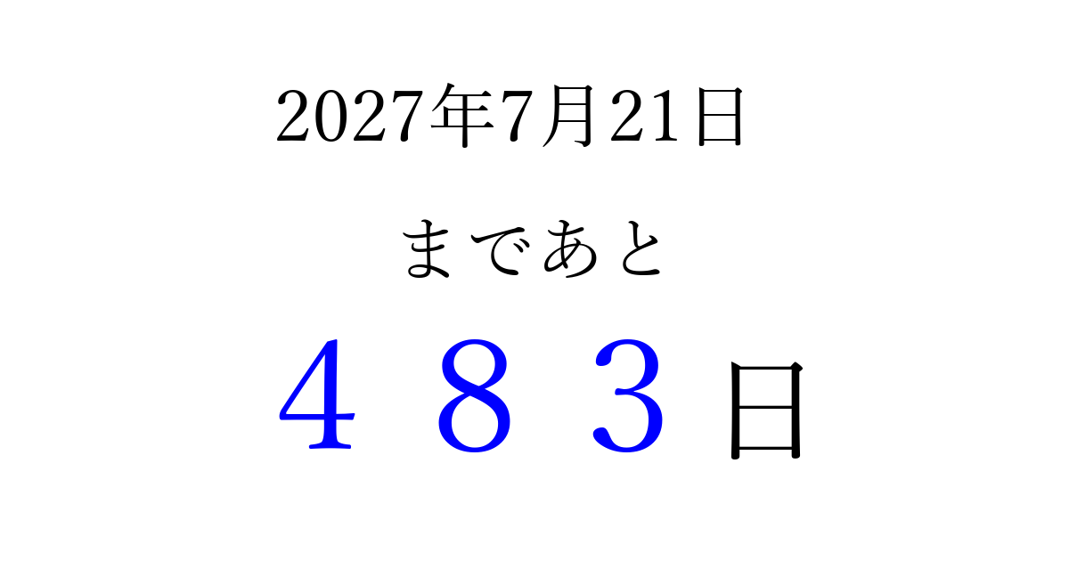 2027年7月21日(水)まで あと 999 日です 追加すると、トップページからすぐ選べるようになります ※2026/03/25現在の結果です。 最新の状態に更新する ↓シェアして、タイムライン上にカウントダウンを表示しよう!↓ 📤 この結果を共有する Tweet シェア Threads Bluesky 別の日付でカウントダウン 2027年7月のカレンダー このページをブックマークに追加すると、いつでもカウントダウンを確認できます。 (PC: Ctrl+D / Mac: ⌘+D) hitome-notes.comでは以下のページも運営しています。 指定日と期間から日付を計算 | ガチャ確率計算・シミュレーション | プライバシー・ポリシー 運営者:Avocado