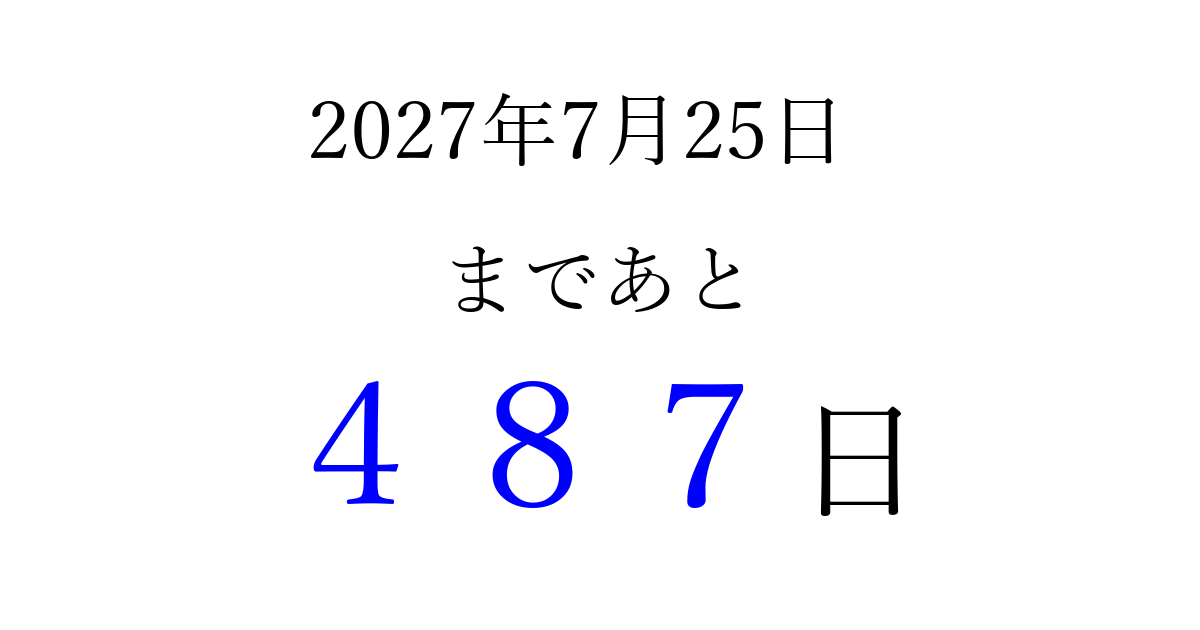 2027年7月25日(日)まで あと 999 日です 追加すると、トップページからすぐ選べるようになります ※2026/03/25現在の結果です。 最新の状態に更新する ↓シェアして、タイムライン上にカウントダウンを表示しよう!↓ 📤 この結果を共有する Tweet シェア Threads Bluesky 別の日付でカウントダウン 2027年7月のカレンダー このページをブックマークに追加すると、いつでもカウントダウンを確認できます。 (PC: Ctrl+D / Mac: ⌘+D) hitome-notes.comでは以下のページも運営しています。 指定日と期間から日付を計算 | ガチャ確率計算・シミュレーション | プライバシー・ポリシー 運営者:Avocado