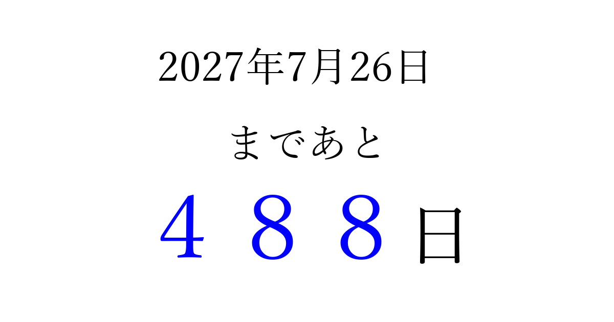 2027年7月26日(月)まで あと 999 日です 追加すると、トップページからすぐ選べるようになります ※2026/03/25現在の結果です。 最新の状態に更新する ↓シェアして、タイムライン上にカウントダウンを表示しよう!↓ 📤 この結果を共有する Tweet シェア Threads Bluesky 別の日付でカウントダウン 2027年7月のカレンダー このページをブックマークに追加すると、いつでもカウントダウンを確認できます。 (PC: Ctrl+D / Mac: ⌘+D) hitome-notes.comでは以下のページも運営しています。 指定日と期間から日付を計算 | ガチャ確率計算・シミュレーション | プライバシー・ポリシー 運営者:Avocado