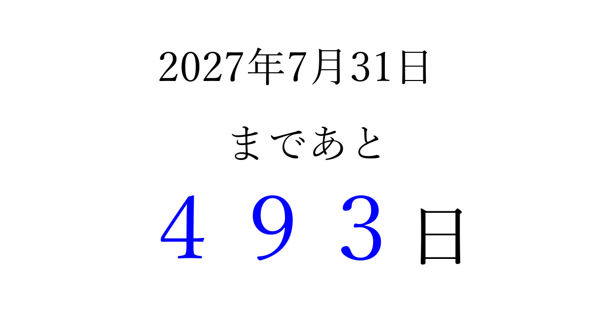 2027年7月31日(土)まで あと 999 日です 追加すると、トップページからすぐ選べるようになります ※2026/03/25現在の結果です。 最新の状態に更新する ↓シェアして、タイムライン上にカウントダウンを表示しよう!↓ 📤 この結果を共有する Tweet シェア Threads Bluesky 別の日付でカウントダウン 2027年7月のカレンダー このページをブックマークに追加すると、いつでもカウントダウンを確認できます。 (PC: Ctrl+D / Mac: ⌘+D) hitome-notes.comでは以下のページも運営しています。 指定日と期間から日付を計算 | ガチャ確率計算・シミュレーション | プライバシー・ポリシー 運営者:Avocado