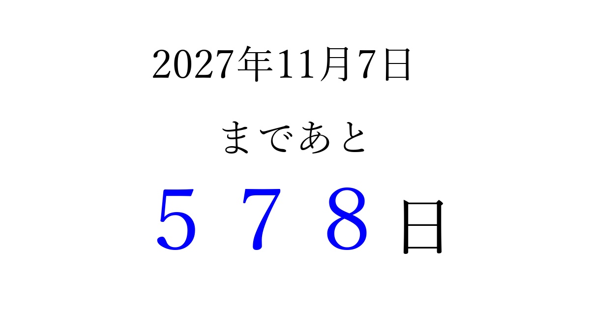 2027年11月7日(日)まで あと 999 日です 追加すると、トップページからすぐ選べるようになります ※2026/04/08現在の結果です。 最新の状態に更新する ↓シェアして、タイムライン上にカウントダウンを表示しよう!↓ 📤 この結果を共有する Tweet シェア Threads Bluesky 別の日付でカウントダウン 2027年11月のカレンダー このページをブックマークに追加すると、いつでもカウントダウンを確認できます。 (PC: Ctrl+D / Mac: ⌘+D) hitome-notes.comでは以下のページも運営しています。 指定日と期間から日付を計算 | ガチャ確率計算・シミュレーション | プライバシー・ポリシー 運営者:Avocado