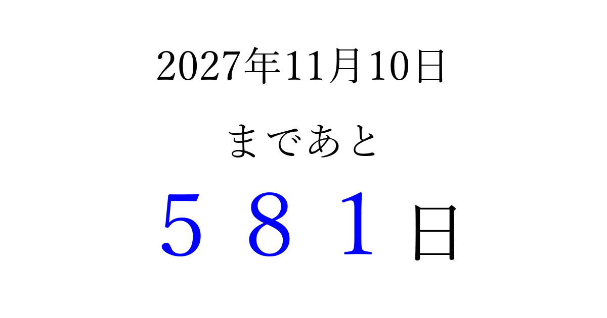 2027年11月10日(水)まで あと 999 日です 追加すると、トップページからすぐ選べるようになります ※2026/04/08現在の結果です。 最新の状態に更新する ↓シェアして、タイムライン上にカウントダウンを表示しよう!↓ 📤 この結果を共有する Tweet シェア Threads Bluesky 別の日付でカウントダウン 2027年11月のカレンダー このページをブックマークに追加すると、いつでもカウントダウンを確認できます。 (PC: Ctrl+D / Mac: ⌘+D) hitome-notes.comでは以下のページも運営しています。 指定日と期間から日付を計算 | ガチャ確率計算・シミュレーション | プライバシー・ポリシー 運営者:Avocado
