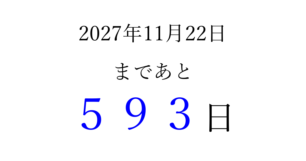2027年11月22日(月)まで あと 999 日です 追加すると、トップページからすぐ選べるようになります ※2026/04/08現在の結果です。 最新の状態に更新する ↓シェアして、タイムライン上にカウントダウンを表示しよう!↓ 📤 この結果を共有する Tweet シェア Threads Bluesky 別の日付でカウントダウン 2027年11月のカレンダー このページをブックマークに追加すると、いつでもカウントダウンを確認できます。 (PC: Ctrl+D / Mac: ⌘+D) hitome-notes.comでは以下のページも運営しています。 指定日と期間から日付を計算 | ガチャ確率計算・シミュレーション | プライバシー・ポリシー 運営者:Avocado