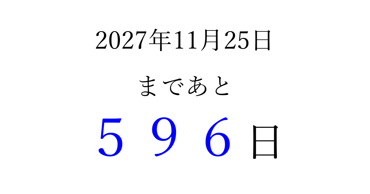 2027年11月25日(木)まで あと 999 日です 追加すると、トップページからすぐ選べるようになります ※2026/04/08現在の結果です。 最新の状態に更新する ↓シェアして、タイムライン上にカウントダウンを表示しよう!↓ 📤 この結果を共有する Tweet シェア Threads Bluesky 別の日付でカウントダウン 2027年11月のカレンダー このページをブックマークに追加すると、いつでもカウントダウンを確認できます。 (PC: Ctrl+D / Mac: ⌘+D) hitome-notes.comでは以下のページも運営しています。 指定日と期間から日付を計算 | ガチャ確率計算・シミュレーション | プライバシー・ポリシー 運営者:Avocado