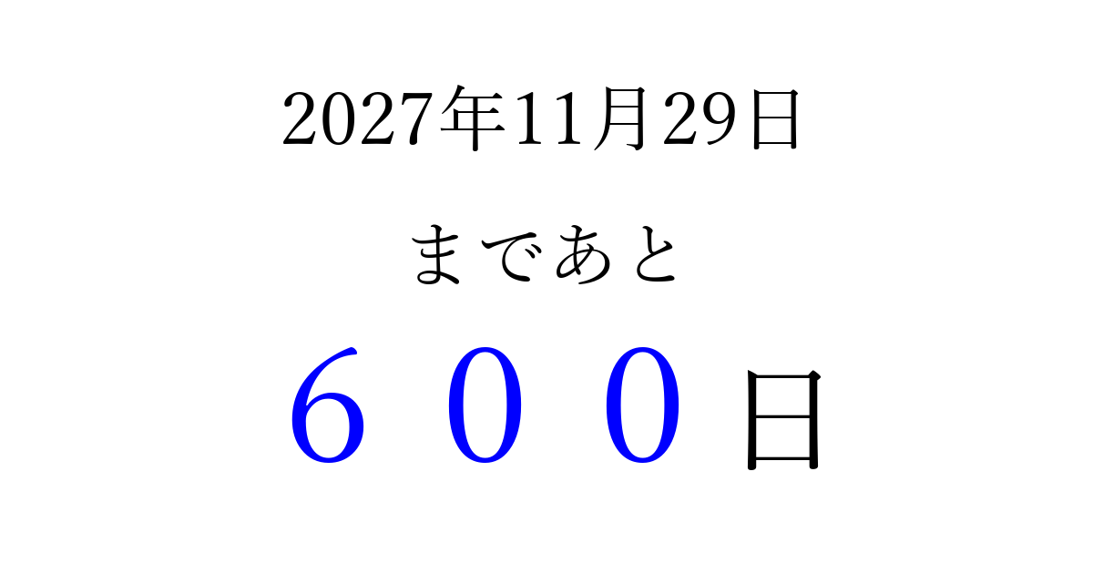 2027年11月29日(月)まで あと 999 日です 追加すると、トップページからすぐ選べるようになります ※2026/04/08現在の結果です。 最新の状態に更新する ↓シェアして、タイムライン上にカウントダウンを表示しよう!↓ 📤 この結果を共有する Tweet シェア Threads Bluesky 別の日付でカウントダウン 2027年11月のカレンダー このページをブックマークに追加すると、いつでもカウントダウンを確認できます。 (PC: Ctrl+D / Mac: ⌘+D) hitome-notes.comでは以下のページも運営しています。 指定日と期間から日付を計算 | ガチャ確率計算・シミュレーション | プライバシー・ポリシー 運営者:Avocado