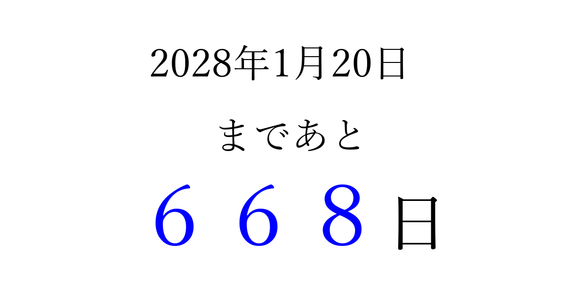 2028年1月20日(木)まで あと 999 日です 追加すると、トップページからすぐ選べるようになります ※2026/03/23現在の結果です。 最新の状態に更新する ↓シェアして、タイムライン上にカウントダウンを表示しよう!↓ 📤 この結果を共有する Tweet シェア Threads Bluesky 別の日付でカウントダウン 2028年1月のカレンダー このページをブックマークに追加すると、いつでもカウントダウンを確認できます。 (PC: Ctrl+D / Mac: ⌘+D) hitome-notes.comでは以下のページも運営しています。 指定日と期間から日付を計算 | ガチャ確率計算・シミュレーション | プライバシー・ポリシー 運営者:Avocado