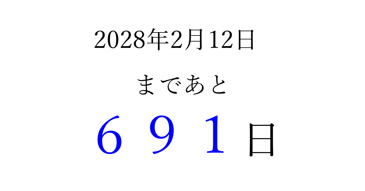 2028年2月12日(土)まで あと 999 日です 追加すると、トップページからすぐ選べるようになります ※2026/03/23現在の結果です。 最新の状態に更新する ↓シェアして、タイムライン上にカウントダウンを表示しよう!↓ 📤 この結果を共有する Tweet シェア Threads Bluesky 別の日付でカウントダウン 2028年2月のカレンダー このページをブックマークに追加すると、いつでもカウントダウンを確認できます。 (PC: Ctrl+D / Mac: ⌘+D) hitome-notes.comでは以下のページも運営しています。 指定日と期間から日付を計算 | ガチャ確率計算・シミュレーション | プライバシー・ポリシー 運営者:Avocado